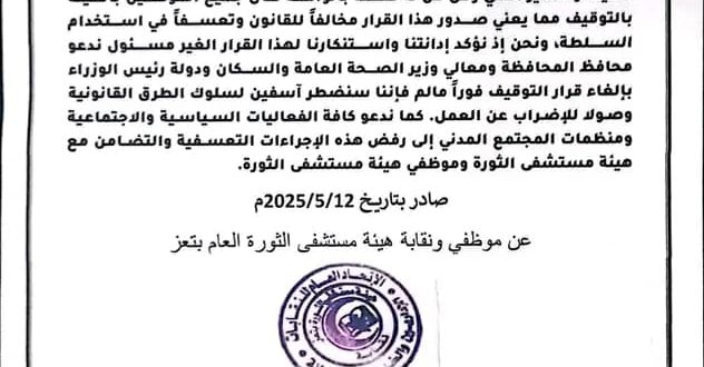 نقابات مستشفى الثورة في تعز تستنكر القرار التسعفي بحق رئيس الهيئة والمدير الفني وتعتبره قرار مخالف للقانون