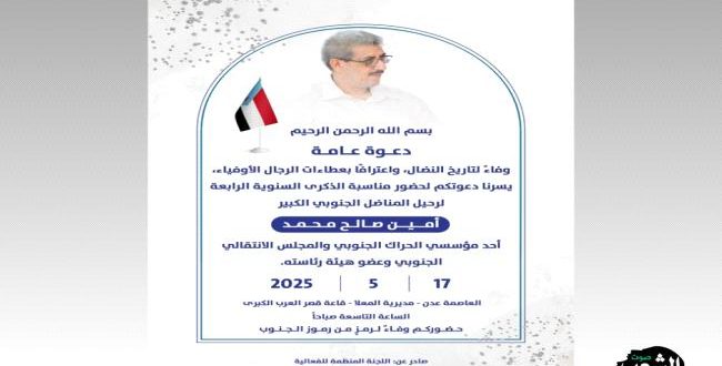 واختتم البيان بالدعوة لجميع أبناء الجنوب للمشاركة في هذه الفعالية التأبينية، وفاءً لتضحيات القائد أمين صالح محمد، وتأكيدًا على استمرار السير في درب النضال من أجل استعادة الدولة والكرامة.