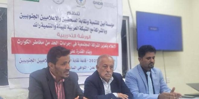 بدات قبل لحظات في مقر النقابة بالعاصمة عدن ورشة تدريبية حول “الإعلام وتعزيزالشراكة المجتمعية في إجراءات الحد من مخاطر الكوارث وبناء القدرات…” تحت رعاية مؤسسة أبين للتنمية ونقابة الصحفيين والإعلاميين الجنوبيين والشبكة العربية للبيئة (رائد) ـ العاصمة عدن