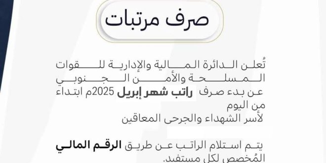 عن بدء صرف راتب شهر إبريل 2025 لأسر الشهداء والجرحى المعاقين .