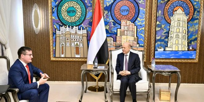 استقبل فخامة الرئيس الدكتور رشاد محمد العليمي، رئيس مجلس القيادة الرئاسي اليوم الخميس، القائم بأعمال السفارة الروسية لدى اليمن يفغيني كودروف، للبحث في مستجدات الأوضاع على الساحة اليمنية والإقليمية، والقضايا الدولية ذات الاهتمام المشترك.