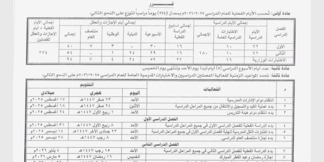 حيث صدر اليوم الأحد القرار الوزاري رقم ٥٣ لعام ٢٠٢٥م بشأن التقويم المدرسي للعام ٢٠٢٦/٢٠٢٥م، والذي أشار إلى موعد انتظام الإدارات المدرسية سيكون يوم الاحد ١٧ أغسطس المقبل، على أن تبدأ عملية القيد والتسجيل والانتقال في جميع المراحل الدراسية يوم الاثنين في الثامن عشر من الشهر ذاته، وانتظام دوام هيئة التدريس في ٢٤ أغسطس، على أن يكون انطلاق الدراسة الفعلية للفصل الدراسي الأول يوم الأحد ٣١ أغسطس ٢٠٢٥م.