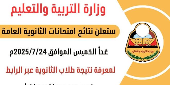 أعلنت وزارة التربية والتعليم بالعاصمة عدن أن يوم غدٍ الخميس سيكون موعد إعلان نتيجة اختبارات الثانوية العامة للعام الدراسي 2024/2025م.