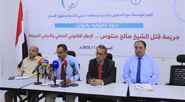 وأكدت الندوة التي نظمتها مؤسسة سوا للحقوق والتنمية، بالشراكة مع منظمة حريتي للتنمية وحقوق الإنسان، اليوم، في مارب، أن ملاحقة مرتكبي جريمة اغتيال الشيخ حنتوس ومحاكمتهم ليست فقط مطلباً حقوقياً، بل مسؤولية وطنية وأخلاقية يتحمّلها الجميع، لضمان عدم إفلات المجرمين من العقاب، وإنصاف أسرة الشيخ الشهيد صالح حنتوس.