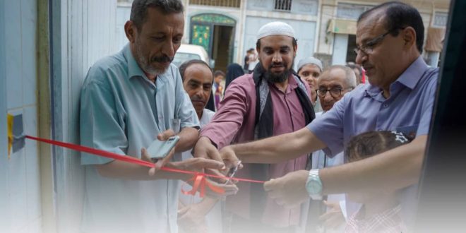 الأستاذ عبدالرحمن المحضار رئيس مؤسسة الهجرة الخيرية للتنمية والدكتور عبدالحكيم المفلحي مدير مكتب الصحة العامة والسكان بمديرية المنصورة.