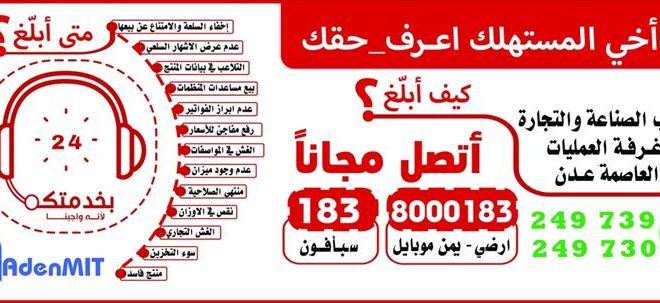 أطلق مكتب الصناعة والتجارة في العاصمة المؤقتة عدن، خدمة مجانية جديدة تتيح للمواطنين الإبلاغ على مدار الساعة عن أي مخالفات أو تجاوزات تمس حقوق المستهلك.وبحسب الإعلان الرسمي، يمكن للمواطنين الاتصال مجاناً عبر الرقم (183) من جميع شبكات الهاتف الأرضي و”يمن موبايل” و”سبأفون”، أو عبر الخط الساخن (8000183)، إضافةً إلى التواصل المباشر عبر تطبيق “واتساب” على الرقمين (249739 – 249730).وتشمل البلاغات التي يمكن للمستهلكين تقديمها قضايا عدة من أبرزها: إخفاء السلع والامتناع عن بيعها، العروض الترويجية الوهمية، التلاعب ببيانات المنتجات، غياب وسائل الأمان على السلع، عدم إظهار الفواتير، رفع الأسعار بصورة غير مبررة، بيع منتجات منتهية الصلاحية، الغش التجاري، سوء التخزين، أو بيع مواد فاسدة.وأكد المكتب أن هذه الخدمة تأتي في إطار سعيه لتعزيز الرقابة وحماية حقوق المواطنين، داعياً المستهلكين إلى التفاعل والإبلاغ عن أي مخالفات لضمان وصول السلع المطابقة للمواصفات وبأسعار عادلة، وبما يحفظ الصحة العامة ويمنع التلاعب بالأسواق.هل ترغب أن أعد صيغة أكثر توسعًا للخبر مع خلفية عن دور مكتب الصناعة والتجارة في عدن خلال السنوات الماضية لمكافحة الغلاء والاحتكار؟