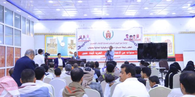شهدت مدينة مأرب، فعالية حقوقية حاشدة بالتزامن مع اليوم الدولي لضحايا الاختفاء القسري، نظمتها رابطة ضحايا حجور بمشاركة 25 منظمة حقوقية ومكاتب حقوق الإنسان وأهالي المختطفين، للمطالبة بالكشف عن مصير أبناء حجور بمحافظة حجة، الذين اختفتهم ميليشيا الحوثي منذ ست سنوات.