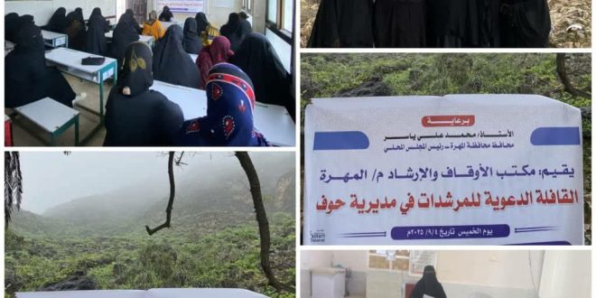 في إطار تفعيل الدور الدعوي والارتقاء بالوعي الديني لدى النساء والفتيات في المجتمع، وبرعاية كريمة من السلطة المحلية بمحافظة المهرة ممثلةً بالمحافظ الأستاذ محمد علي ياسر، نظّم مكتب الأوقاف والإرشاد بالمحافظة يوم الخميس الموافق 4 سبتمبر 2025م، قافلة دعوية إلى مديرية حوف، بمشاركة خمس داعيات توزّعن على أربع مناطق: