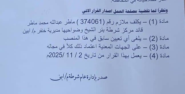 الجدير ذكره أن صدور قرار التعيين كان بتاريخ 2025/11/2، والذي يأتي استحقاقًا لكفاءته العسكرية وانضباطه المهني، وكذلك لاستحقاقه في تولي هذا المنصب.