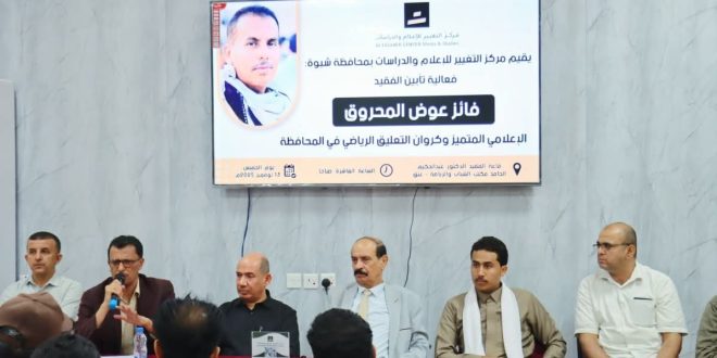 وفي ختام الحفل، كرّم مركز التغيير للإعلام والدراسات، أسرة الفقيد بدرع الوفاء، تقديرًا لمسيرته الإعلامية الزاخرة بالعطاء والتميز، وتأكيدًا على أن الوفاء للرواد هو جزءٌ أصيلٌ من ثقافة شبوة، التي تحتفي بأبنائها وتخلّد ذكراهم.