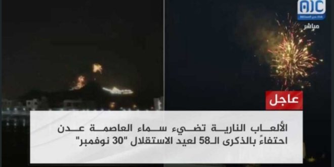 تضيئ سماء مدينة عدن، في هذه الساعات من مساء اليوم السبت 29 نوفمبر 2025م، بالالعاب النارية، احتفالاً بالذكرى ال 58 لعيد الاستقلال الوطني 30 نوفمبر 2025م.