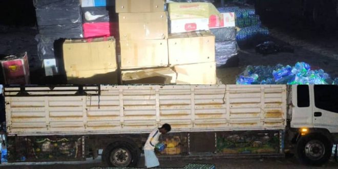 وخلال التفتيش الدقيق، عُثر على 120 كرتونًا من السجائر المهربة نوع (PLATINUM – بلاتين بُن) مخفية بطريقة احترافية أسفل الحمولة، في حين وُضعت فوقها حمولة مموّهة مكوّنة من 1200 كرتون ماء (أروى) و 50 كيس حليب مجفف بهدف التمويه وتضليل النقاط الأمنية.