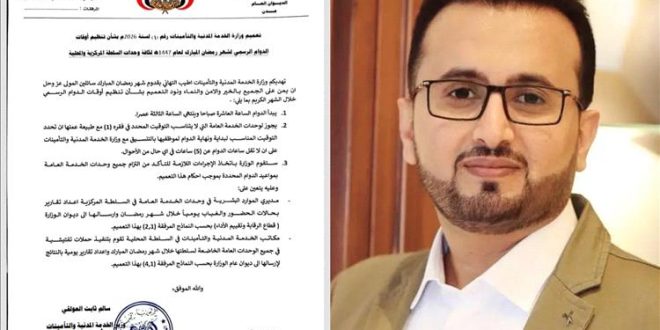 أصدرت وزارة الخدمة المدنية والتأمينات تعميماً رقم (1) لسنة 2026م بشأن تنظيم أوقات الدوام الرسمي خلال شهر رمضان المبارك لعام 1447هـ، في أول قرار يصدر عقب تولي الوزير سالم ثابت العولقي مهام منصبه.ونص التعميم على أن يبدأ الدوام الرسمي في كافة وحدات السلطة المركزية والمحلية الساعة العاشرة صباحاً وينتهي الساعة الثالثة عصراً، مع السماح للوحدات التي لا يتناسب معها هذا التوقيت بتحديد مواعيد مناسبة لبداية ونهاية الدوام بالتنسيق مع الوزارة، على ألا تقل ساعات العمل اليومية عن خمس ساعات.وأكدت الوزارة أنها ستتخذ الإجراءات اللازمة لضمان التزام مختلف وحدات الخدمة العامة بمواعيد الدوام المحددة، وفقاً لأحكام التعميم.كما ألزم التعميم مديري الموارد البشرية في وحدات السلطة المركزية بإعداد تقارير يومية عن الحضور والغياب خلال شهر رمضان وإرسالها إلى ديوان الوزارة ممثلاً بقطاع الرقابة وتقييم الأداء، بحسب النماذج المعتمدة.وفي السياق ذاته، كلفت الوزارة مكاتب الخدمة المدنية والتأمينات في السلطة المحلية بتنفيذ حملات تفتيش ميدانية على الوحدات العامة الخاضعة لنطاقها خلال الشهر الكريم، وإعداد تقارير يومية بنتائجها ورفعها إلى ديوان عام الوزارة.واختتم التعميم بالتأكيد على أهمية الالتزام بما ورد فيه، بما يسهم في تعزيز الانضباط الوظيفي وضمان استمرارية تقديم الخدمات للمواطنين خلال شهر رمضان المبارك.