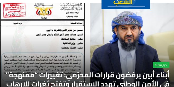 وأضافوا أن توقيت القرارات يثير العديد من علامات الاستفهام، لا سيما بعد الالتفاف الشعبي والرسمي خلف القيادات الأمنية في أبين، ونجاحها في تثبيت الأمن ومواجهة الجماعات المتطرفة، معتبرين أن ما جرى يعكس تنفيذ “أجندات خارجية ومحلية” ضمن إطار الشرعية، على حد تعبيرهم.