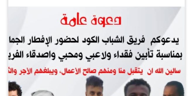 يستعد فريق الشباب الرياضي بمنطقة الكود بمحافظة أبين لإقامة مائدة إفطار جماعي يوم الأربعاء القادم الموافق 22 من شهر رمضان المبارك، وذلك إحياءً لذكرى لاعبي الفريق ومحبيه الذين رحلوا عن الحياة.
